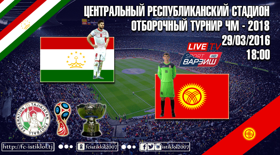 Сегодня, 29 марта, национальная сборная Таджикистана проведет свой заключительный матч в рамках второго раунда отборочного турнира чемпионата мира-2018. На Центральном республиканском стадионе в центральноазиатском дерби наша сборная примет команду Кыргызстана. Сегодня сборной Таджикистана очень нужна наша общая и мощная поддержка! Давайте вместе поболеем за наших!!! Идем на футбол!!! Вместе мы добьемся победы!!! Приходите на главную арену страны, насладитесь футболом и окунитесь на пару часов в настоящую атмосферу игры номер один!!!