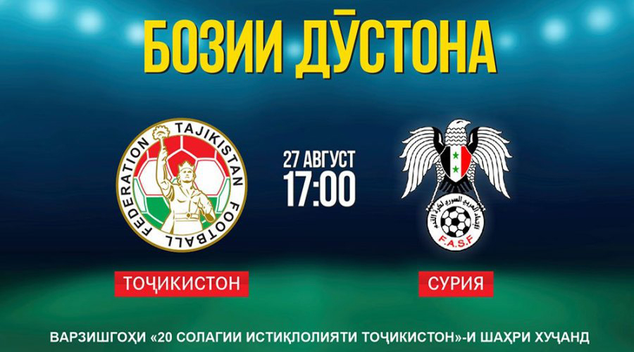 Сегодня, 27 августа, на стадионе «20-летия Независимости Таджикистана» в Худжанде состоится товарищеский матч между национальными сборными Таджикистана и Сирии.