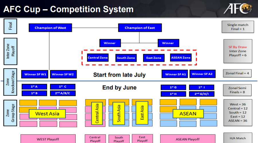 После завершения группового этапа будут сыграны интерзональные полуфиналы и финалы, а затем финальный поединок, который пройдет 2 ноября. Отметим, что Кубок АФК-2019 будет проводиться в пяти зонах по региональному принципу. Западная зона, которая в последние годы доминирует, останется без изменений и ее победитель получит право сыграть в финале. За вторую путевку в финал поборются победители оставшихся четырех зон: Восточная, АСЕАН, Центральная и Южная.